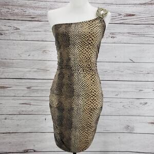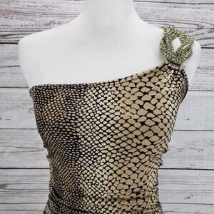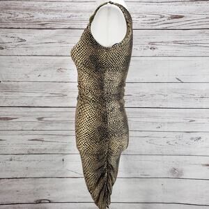 Cache Women's Brown Black One Shoulder Snakeskin Print Ruched Bodycon Dress Size Small. NO Fabric tags in Stretchy polyester type fabric. Approx. measurements pit to pit 15 in. Waist 23 in. Stretch 29 in. Dress length 27 in. Pre-owned in good condition, no holes or stain.