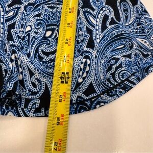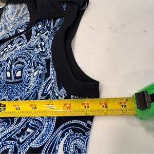 Excellent condition. Women’s Cache sleeveless collared button down blouse. Blue white and black print, gold metal buttons. Size medium. See photos for measurements