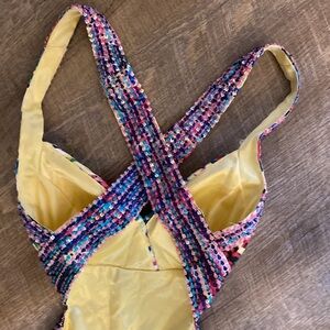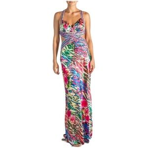 Vibrant and stylish, this multicolor floral maxi dress is perfect for any occasion. Featuring a stunning blend of colors, it offers a unique and eye-catching look. Beaded criss cross back. Excellent preowned condition. No rips, stains, or odors. See all photos. Early 2000s.