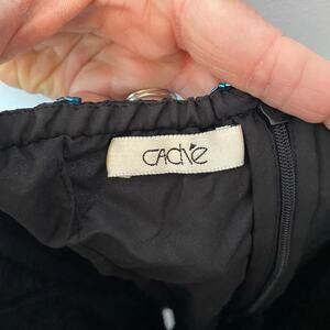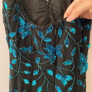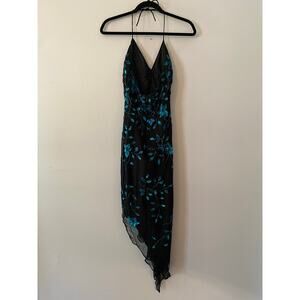 Stunning Cache Women's size XS Y2K halter midi dress. Features a beautiful black and blue color scheme with intricate beaded floral detailing. Made from 100% silk, this dress offers a luxurious feel and a flattering fit. The handkerchief hem adds a touch of uniqueness to the asymmetrical design.