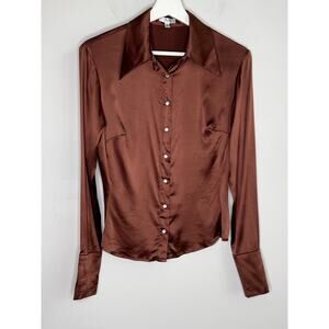 Cache Silk Blend Long Sleeve Collared Satin Button-Up Shirt Brown Women's Small