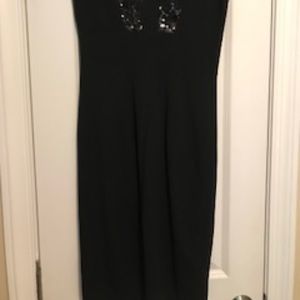 Dressy Cache Sheath style dress, never worn. This is a sheath style dress with sequins in the front and back upper portion of dress. Nice weighted material, short sleeve. Dressy, elegant wedding, special occasion for a funeral as the sequins are not gaudy.