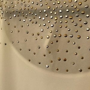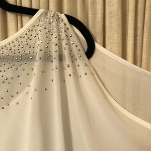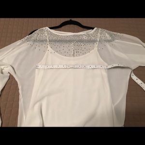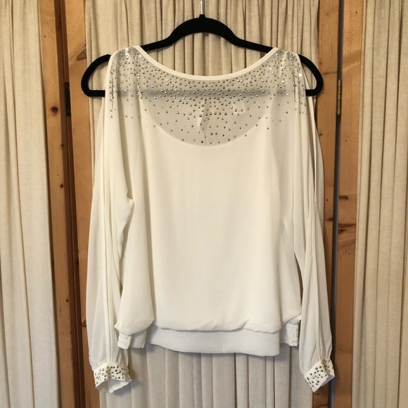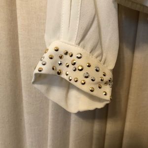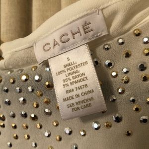 Cache blouse in a very soft white is decorated with silver and gold beads along neckline and cuff of sleeve. Shoulders are open. It has a lining attached underneath with three gold buttons in back. No tags, excellent condition.