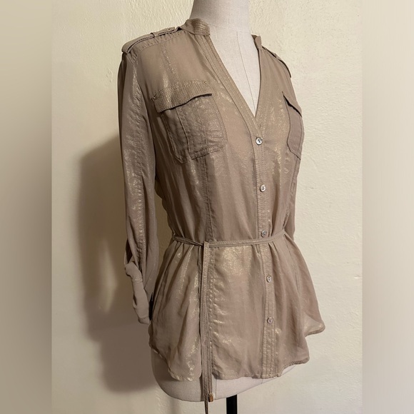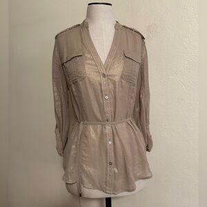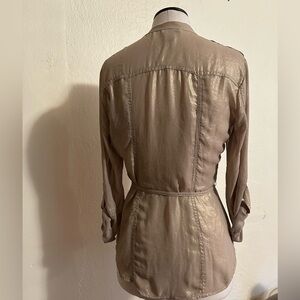 Button down utility shirt. Can be worn with or without attached belt. Shimmery gold. Perfect for work or with denim for a night out!