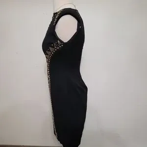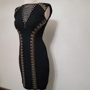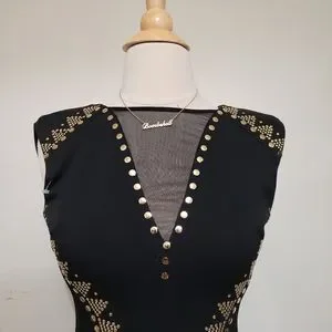 For wear is a little black bodycon mesh dress from the now defunct brand Cache'. It is embellished with studs all over it, 2 way mesh for reinforcement and built in shoulder pads. The back is in an open design whit snaps to close it across the shoulders. Very little wiggle room because of the spandex, the studs are not tacked.