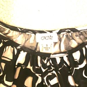 Black and white cold shoulder light top by Cache . In Great used condition . No flaws . Sleeve is not a full length elastic band is supported in the end of Sleeves .