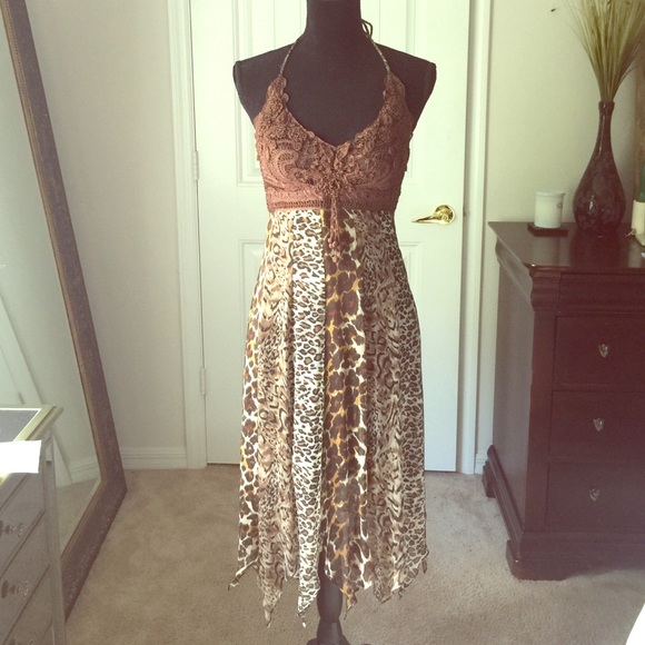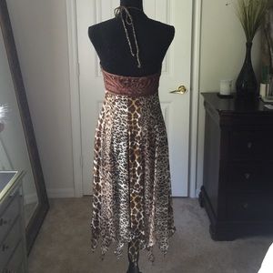 Cache size 4 multi animal print dress. Crochet bust, cute tassel detail on front, side zip, halter neck tie, handkerchief hem. Sheer animal print lined to about knee length, handkerchief hem falls below knee. Perfect condition, worn twice! 💖smoke free home 💖