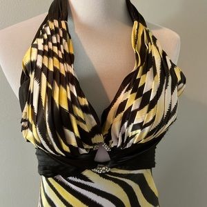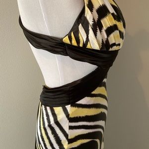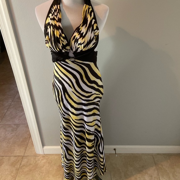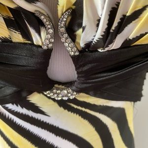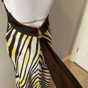 Gosh this dress is sexy and trendy animal print. It’s just enough revealing but leaves something to the imagination with the long silky bottom. The stone detailing and low back will garnish the right amount of attention. Worn once to military ball. Perfect condition. Smoke and fur free home