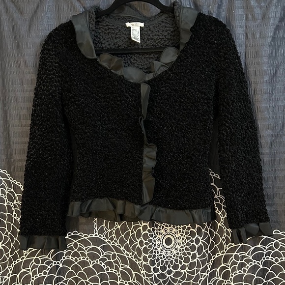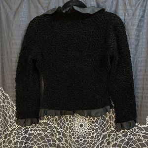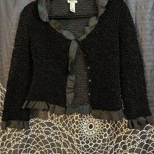 Black Velvety Evening jacket with snap closures. All closures in working condition, jacket is short and in excellent condition. Women’s size 6, ships from a pet and smoke free home.