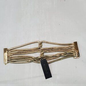 Cache bracelet is a luxurious and substantial piece, featuring eight strands of flexible gold-toned snake chain intricately woven and held together by a secure magnetic clasp. It creates a bold, multi-strand look with a smooth, fluid texture.