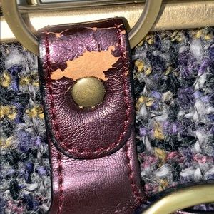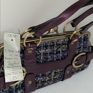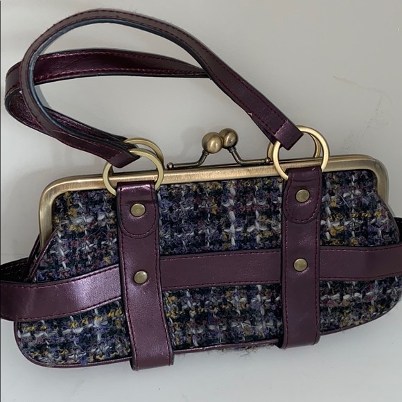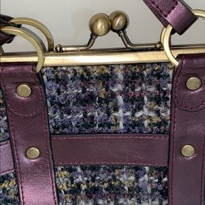 Brand new Cache clutch handbag. Purple and gold tweed plaid bag. Tag still on it but peeling a little as seen in last photo - probably from sitting in the closet. Really cute clutch!