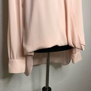 Cache light pink rhinestone bead faux wrap draped top. Pullover style with v neckline. Rhinestone bead embellishment on shoulders. Faux wrap draped front. High low curved hemline. Button cuff sleeves. Size Extra Large XL. Very good preowned condition. A couple of loose beads and small snag on front neckline.