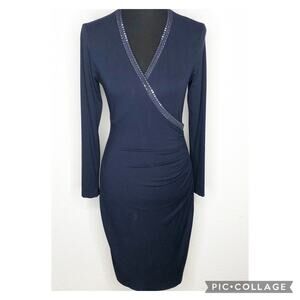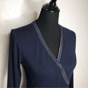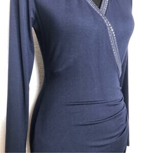 Cache navy blue metallic studded trim sheath dress. V neckline with metallic studded trim. Faux wrap top. Ruching on side hip. Long sleeves. Size Medium. Excellent preowned condition. A couple of tiny smudges.