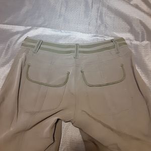 These light, army green pants are 70% modal and feel like silk. Super light weight for the summer weather. Front and back pockets with drawstrings at the ankle.