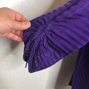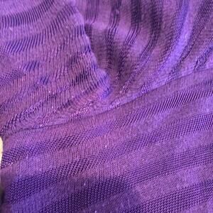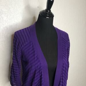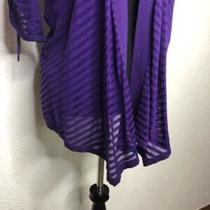 Cache purple striped tie sleeve open front cardigan. Full open front with draped lapes. Ruched drawstring tie sleeves. Lightweight. Solid sheer striped. Size Medium. Good preowned condition. One tiny snag on front and one on back. Slight fade on inside under arms doesn’t really show on outside. Minor wash wear.