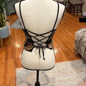 Cache Top Shimmer in style with this stunning sequin camisole top. Featuring a vibrant mix of black, gold, silver, and brown, this top is perfect for a night out. Pair it with your favorite jeans or skirt for a chic look.
