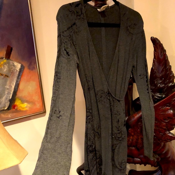 Gray dress long sleeved touches just below the knee. Black details with a little shimmer on it. Very body fitting and body flattering. Low V neck. Small size will for medium as well, but again, it’s meant to be body hugging
