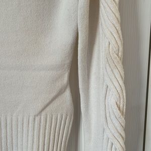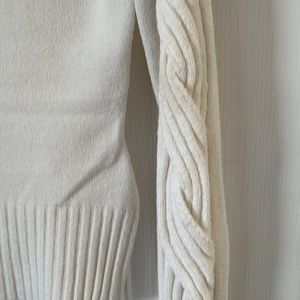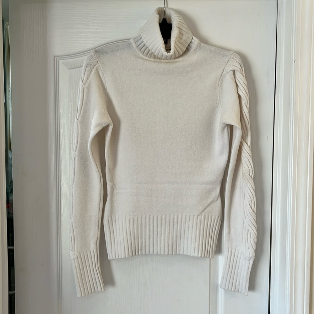 Beautiful cache turtle neck sweater, cable styled sleeves with openings, size large, good condition