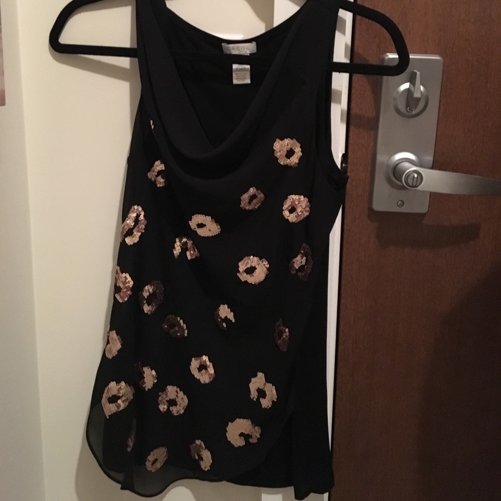 This is a black flow tank top. It has a sheer/Nash material on the front with gold sequin. The Bach is cotton