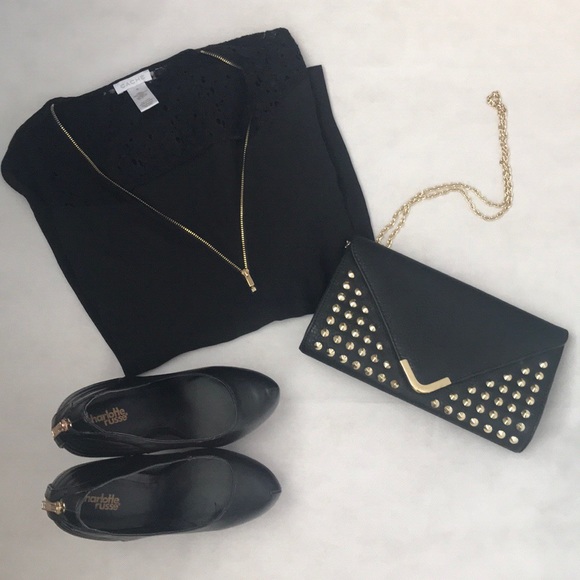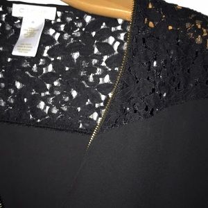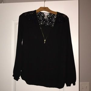 Black cache top. Loose fitting with lace embellishment at neck, zipper gives you the option of a more conservative or sexy look