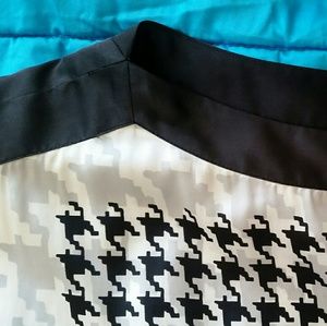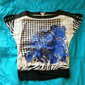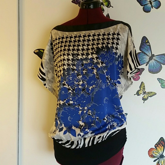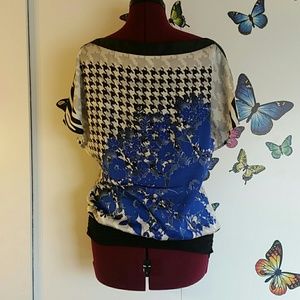 Classy and figure-flattering silk top with boat neckline, elasticated band (black part) at the hips. Lightly worn, no defects. Size is marked as "S", but it fits a 5'5, 150 lbs person nicely. Simple but effective design. I don't think the size marking accurately reflects