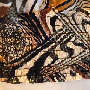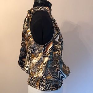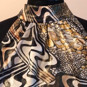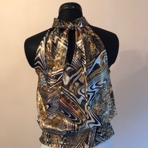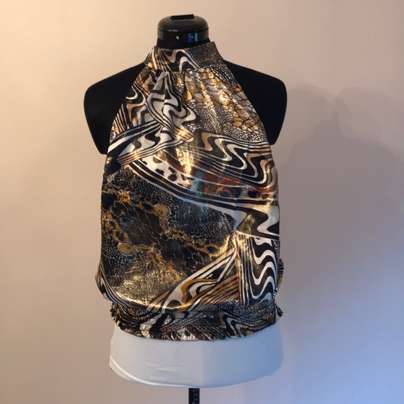 Racer front and back. Tie at back neckline. Has elastic at waist to blouse up. Metallic gold. Stunning