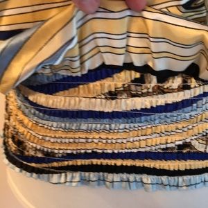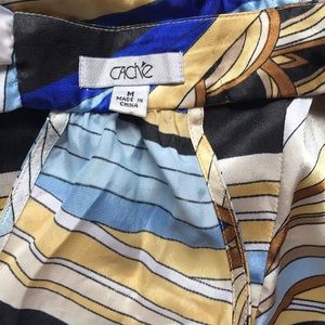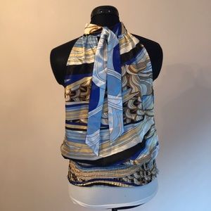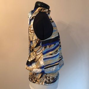 Blue, gold, black, gold silky top. Has a wide elastic band at bottom to blouse up. Excellent condition