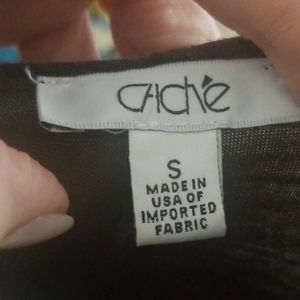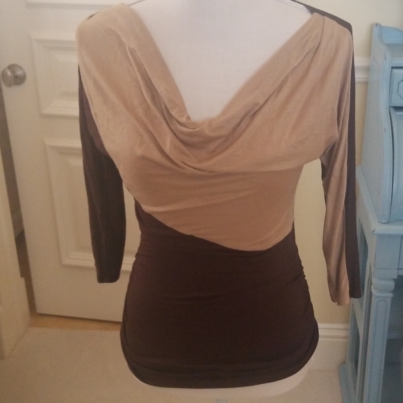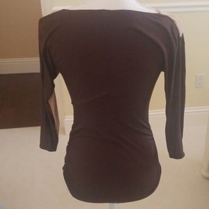 Cache beige and brown stretch cotton top. Ruched on sides, with scooped neckline. Sleeves are 3/4.