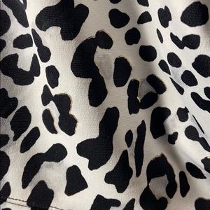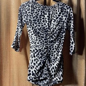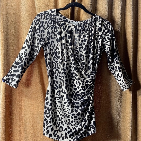 CACHE animal print faux wrap crossbody with V neckline. Black white with a hint of gold lured