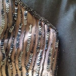 Small black beaded with black sequin over ombré brown top. Some sequins have pulled, but not incredibly noticeable when on. See last photo for close up.