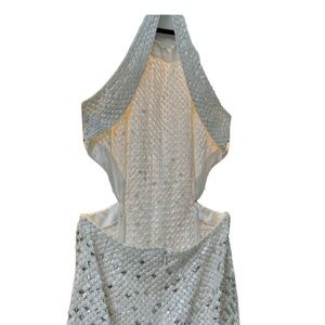 Cache sliver white and nud sequins maxi dress size 6 great condition armpit to armpit 19 inches waist 13.5 inches shoulder to hem 57 inches