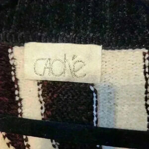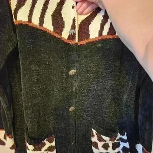 Cache womens button down sweater size L black and white animal print. nice warm heavy sweater. there are a few loops on the black part.
