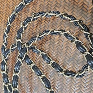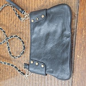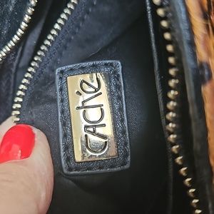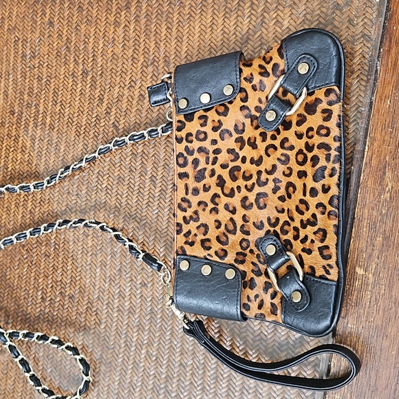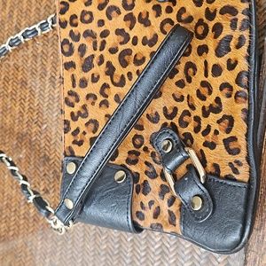 This measures 9 x 6. Man made material (faux leather) and faux hair animal print. Chain with woven in man made material. It's very attractive. Has a little bit of peeling at the opening. See pictures. Selling as is so the price is according to condition.