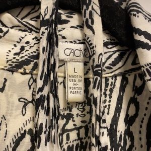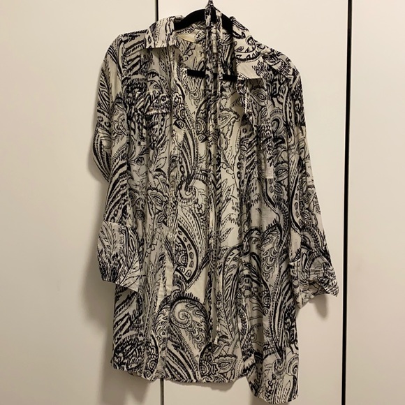 Fun patterned black and off white button down long top with matching fabric tie (can be used as belt, neck tie or hair tie). Slight yellowing on inside tag area but nowhere exterior. This is a size L.