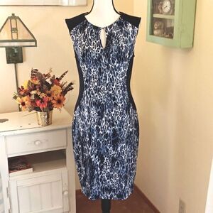 Designed to be flattering, the black panels on the side create a slim silhouette . Blueish animal print. Keyhole at front. Fully lined. Back zip. No size tag. Measures 38 at chest, 30 at waist, 40 at hips, 35 af bottom hem for a perfect pencil shape. (8) Comfortable and great looking.