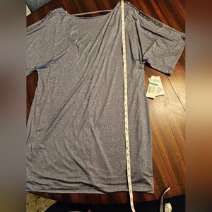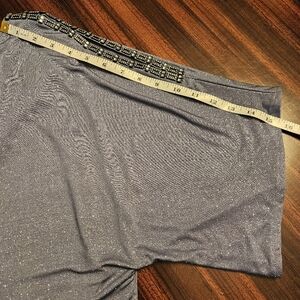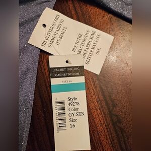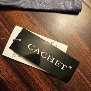 Brand new with tags elegant blue gray mini dress from Cachet. Short cold shoulder sleeve accented with rhinestones, glittery all over, fully lined. Deep cowl drapey back.