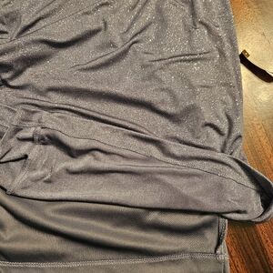 Elegant gray dress with shimmering fabric and rhinestone detail on shoulders. Perfect for a night out or cocktail party.