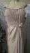 This elegant cream evening dress features a beautifully pleated bodice and a delicate floral accent at the waist. Perfect for special occasions. It offers a sophisticated and a timeless look.