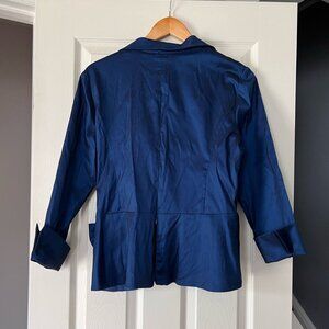 Elegant and eye-catching, this Cachet women’s blouse top in size 14 is designed for formal events, cocktail parties, or special occasions. Made in a rich blue satin-like fabric with a wrap front and dramatic side bow featuring a jeweled accent, this piece makes a stunning statement.