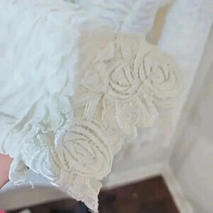 Vintage. Beautiful details with ruffling and pearls. Beautiful piece. It does have a light stain in the back ( shown in photos)