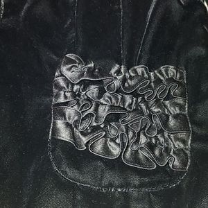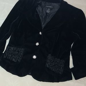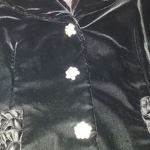 Size 10. Black velvet material. Button down. Slightly padded shoulders. Pit to pit 19". Length 23". Arm length from pit 13".