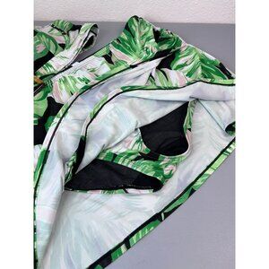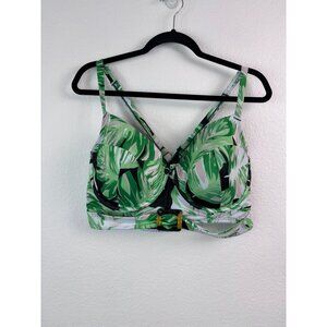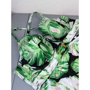 Cacique brand women's size 42DD (top) 20 (bottoms) green tropical leaf printed bikini swim set. In like new condition, little to no sign of wear. Top is a lightly lined balconette style with underwire cups. Straps can be worn crossback or regular. Skirted bottoms have a full wrap style skirt with attached briefs.