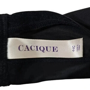 Cacique Balconette Wire-Free Bra in Black. Size 44C. Features wireless, adjustable straps, and back hook-and-eye closure. Cup: 100% Polyester. Back Wing: 82% Nylon, 18% Spandex. Some creasing in cups as shown in photos.