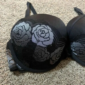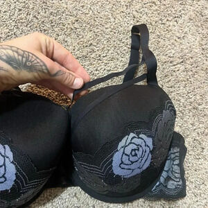 Cacique Bra 40DD Black Lightly Padded Pushup Plunge Underwire Blue Lace Rose