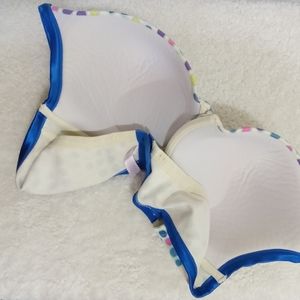 Cacique Bra- white with royal blue trim & multi color polka dots. under wire, wide adjustable straps, hook and eye closure.