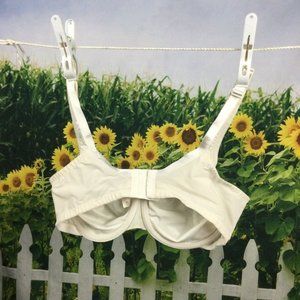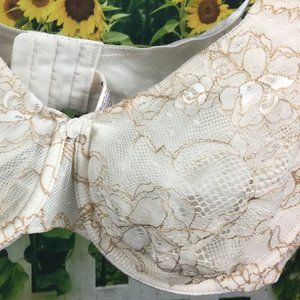 Cacique for lane bryant bra, white with a lace overlay in white and dark gold color. Underwire, very lightly padded with adjustable strap and back hook closure. Good used condition.