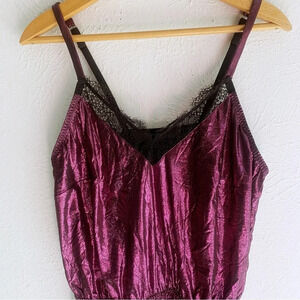 Foil fabric. V-neck. Sleeveless. Adjustable cami straps. Covered elastic waist. Foiled microfiber with lace trim. No closure, pull-on style.