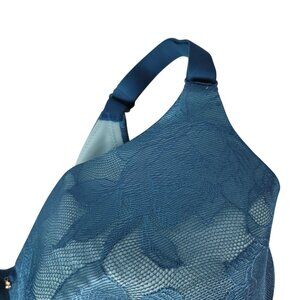 Cacique Teal Green Blue Bra Underwire Lightly Lined Full Coverage Adjustable Strap Floral Lace Overlay Square Back. Very good pre-owned condition with no stains or tears. Please see last picture for flaw in lace on right cup.
