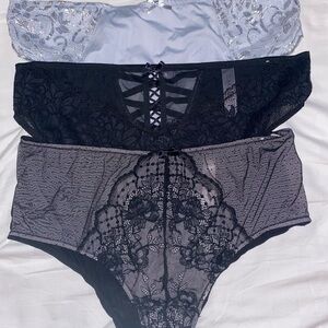 Stylish lace panties set by Cacique. Features intricate lace patterns. Includes black and gray options. Comfortable and chic.