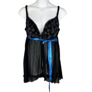 Cacique Womens 3X Babydoll Teddy Black Blue Floral Embroidered Bow Nightgown